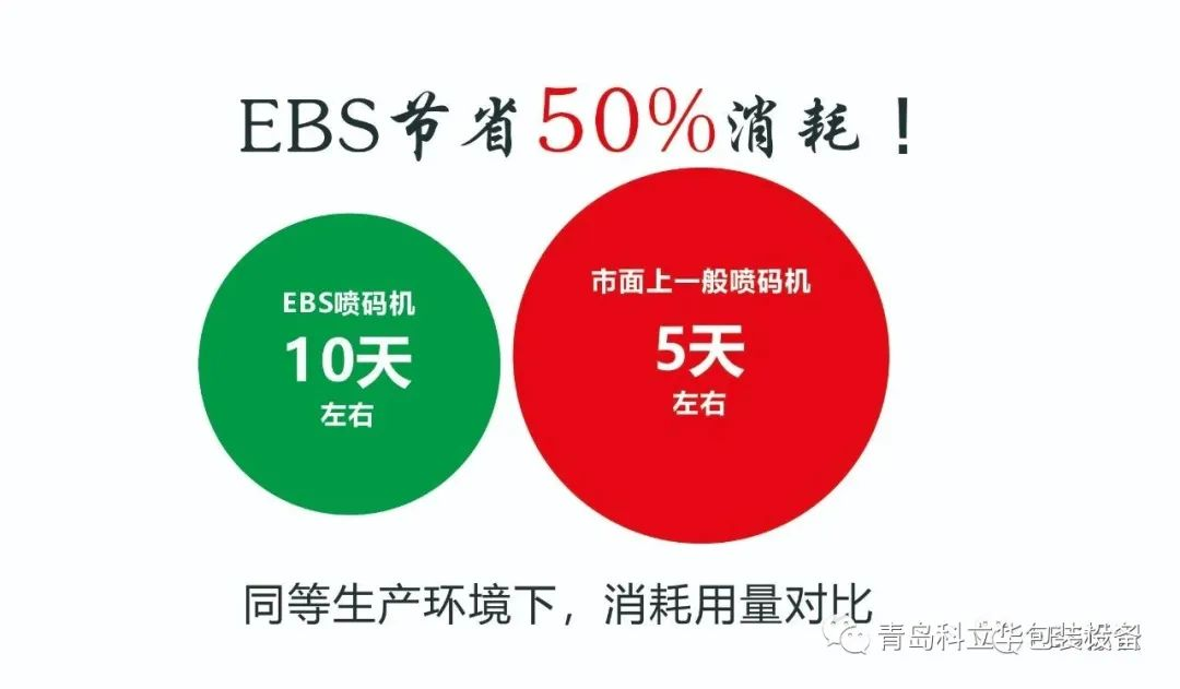 只有19瓦的電力消耗、市面上的CIJ噴碼機(jī)平均60瓦;同等生產(chǎn)環(huán)境下,EBS噴碼機(jī)一瓶溶劑經(jīng)過測試可使用約12-15天,市面上一般噴碼機(jī)一瓶溶劑的使用時(shí)長為3-5天!EBS可為客戶節(jié)省大概60%的能耗!